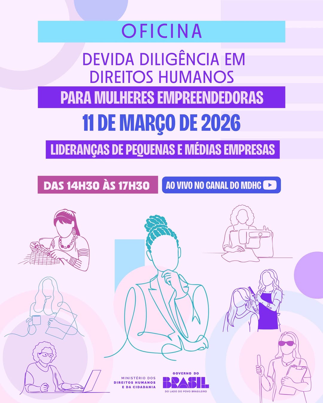 O Ministério dos Direitos Humanos e da Cidadania (MDHC), por meio da Secretaria Nacional de Defesa e Promoção dos Direitos Humano, promove, no dia 11 de março de 2026, das 14h30 às 17h30, a oficina “Devida Diligência em Direitos Humanos para Mulheres Empreendedoras“.