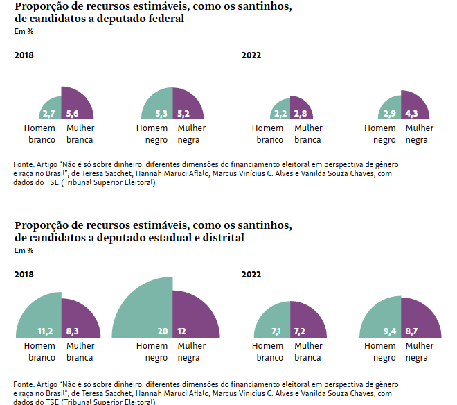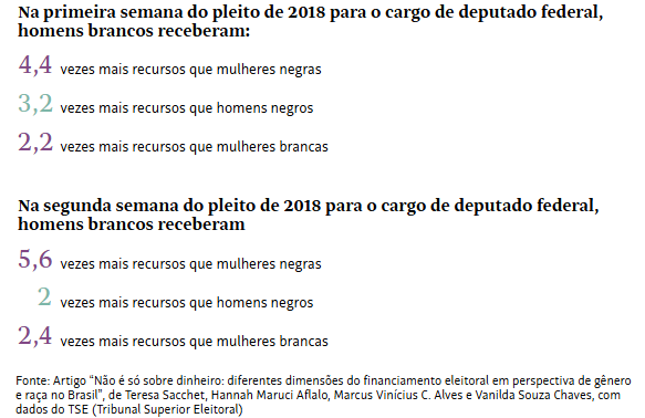 A tendência ocorreu entre aqueles que disputaram em 2018 o cargo de deputado federal. Homens brancos receberam 4,4 vezes mais recursos na primeira semana de campanha do que mulheres negras. Na segunda semana, eles receberam 5,6 vezes mais que este segmento.