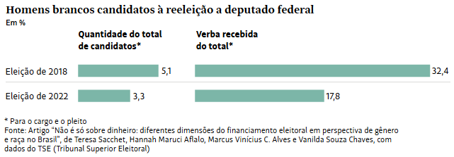 Homens brancos pleiteando a reeleição corresponderam a 5,1% dos candidatos a deputado federal em 2018, mas receberam 32,4% da verba. Em 2022, esse grupo era 3,3% do total, mas recebeu 17,8% dos recursos.